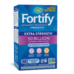 Фортифай™ Пробиотик + пребиотици за жени Extra Strength е симбиотик (комбинация от пробиотици плюс пребиотици) от най-висок клас, който Nature's Way създава специално за жени! Да, това е продукт с патентована пробиотична смес Fortify Daily®, осигуряваща 10 щама, или общо 50 млрд. CFU (жизнеспособни бактерии) – лактобацили и бифидобактерии, плюс пребиотици от фибри на цикория. Те действат синергично и таргетирано именно при най-често срещаните проблеми на деликатното женско здраве.