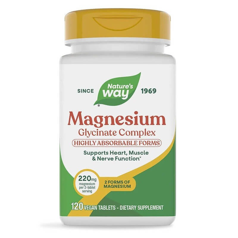 Комплексът на Nature's Way съдържа магнезиев глицинат и магнезиев малат с висока абсорбция. Само две таблетки на ден са достатъчни за ефективна подкрепа на сърдечната, мускулната и нервната функция. Поради отличната си бионаличност, активното вещество се усвоява лесно и ефективно от тялото и предоставеният минерал се използва максимално. Комплексът помага за поддържането на оптимални нива на магнезий в организма за нормално функциониране на всички системи. За предпочитане е да се приема с храна. За допълнително улеснение, приемът на дневната доза може да се направи с едно от планираните хранения – най-добре със закуската.