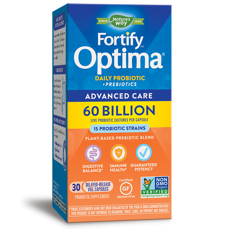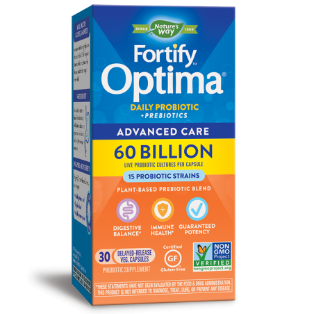 Fortify™ Optima® Probiotic Advanced Care представлява мощен синбиотик, комбиниращ пробиотични култури и патентована пребиотична смес, с чиято помощ балансът на чревната флора се връща значително по-бързо, отколкото само с пробиотик.