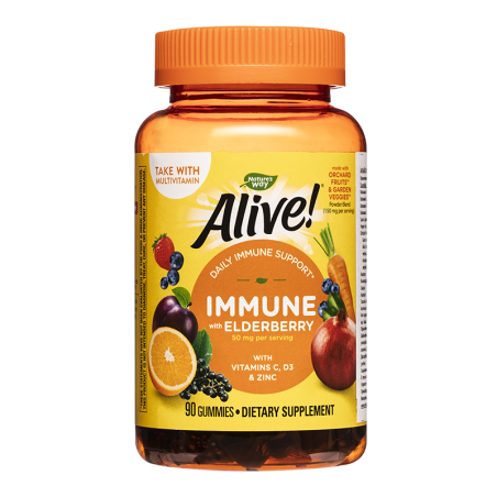 Alive! Immune Gummies / Алайв! Имунна защита е част от голямата серия Алайв! мултивитамини на реномирания американски производител Nature’s Way. Продуктът съдържа балансирана комбинация витамини: А, С, D, Е, минерала цинк, екстракт от черен бъз, както и патентована смес овощни плодове и градински зеленчуци Orchard Fruits™ Garden Veggies™ (акай бери, ананас, банан, боровинка, грозде, круша, малина, нар, портокал, череша, ябълка, ягода, тиква, аспержи, броколи, брюкселско зеле, грах, домат, зеле, карфиол, краставица, морков, спанак).