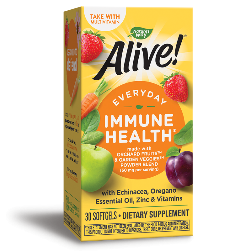 Alive Immune Health е природна формула за поддържане нормалното състояние на имунната система и облекчаване симптомите на респираторните инфекции. Съдържа масло от риган, цинк, витамини А, С и D3, и екстракт от ехинацея. Съставът й е обогатен с антиоксидантната смес Orchard Fruits™ & Garden Veggies, която съчетава екстракти от плодове и зеленчуци с общ тонизиращ ефект.